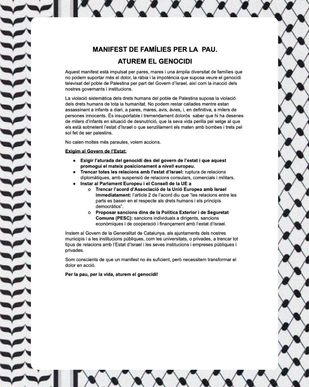 #Comunicat | Ens adherim: MANIFEST DE FAMÍLIES PER LA PAU. ATUREM EL GENOCIDI.